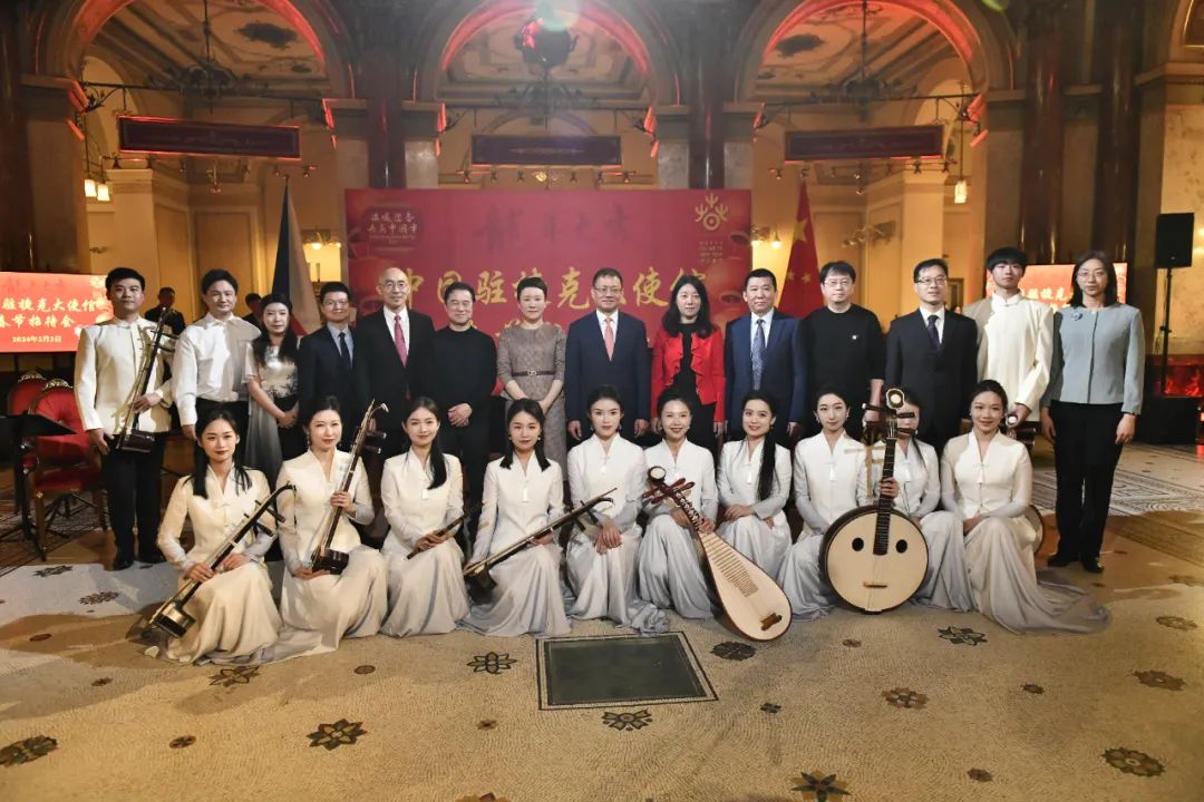 2月3日晚,中国驻捷克大使馆在具有百年历史的中信欧洲控股总部大楼宴会厅举办2024年春节招待会,浙音民族室内乐团为现场的旅捷华人华侨、中资企业人员、孔子学院教师、留捷学者和学生代表等近400人表演了古筝独奏《渔舟唱晚》、二胡曲《赛马》、琵琶独奏《十面埋伏》等中国经典民乐。